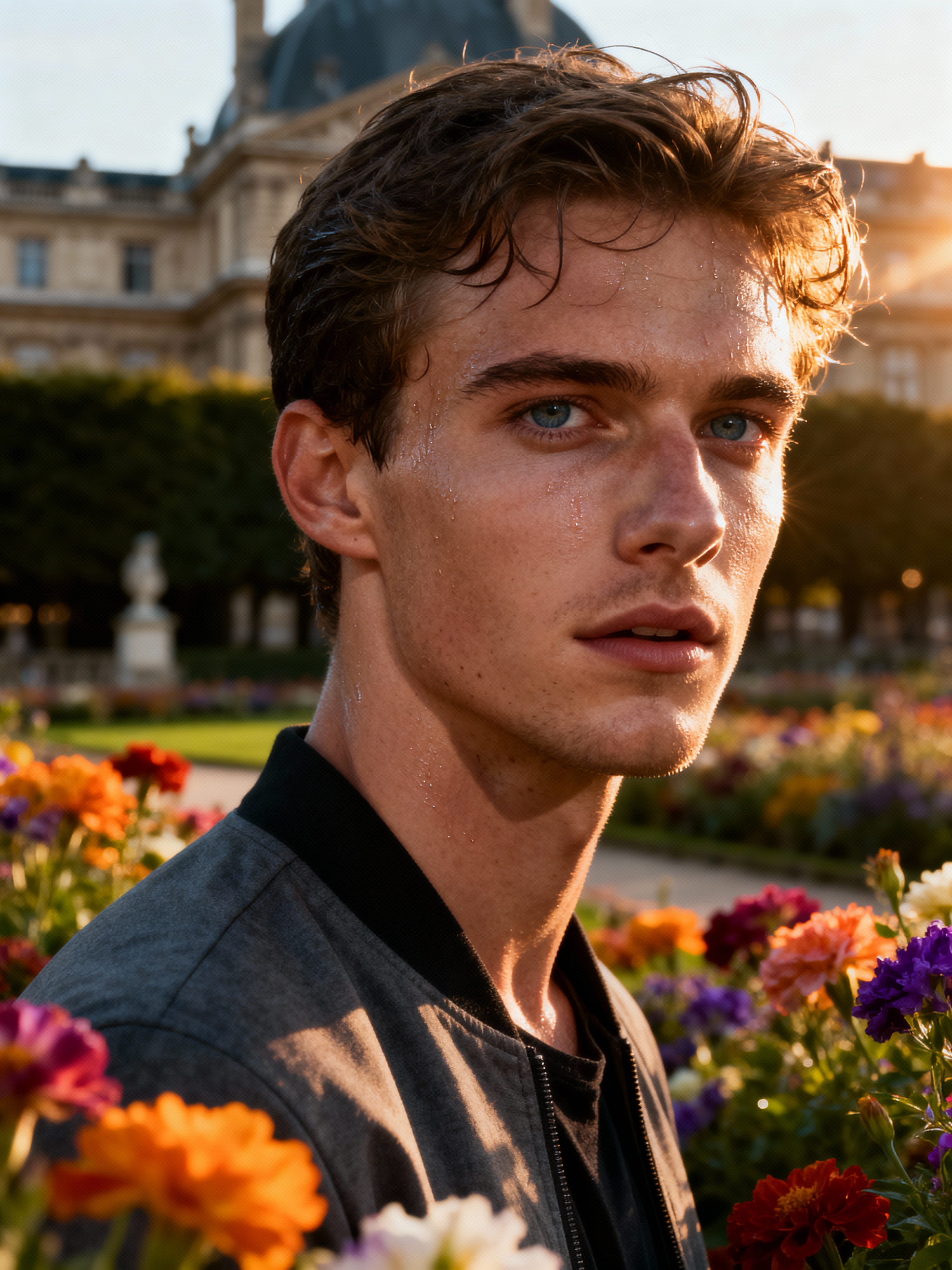 model in Luxembourg Gardens, wearing a modern casual outfit, surrounded by blooming flowers