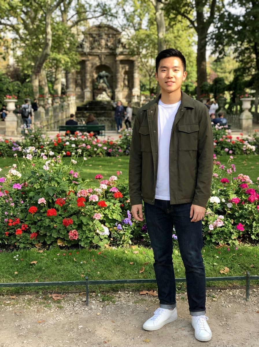 model in Luxembourg Gardens, wearing a modern casual outfit, surrounded by blooming flowers
