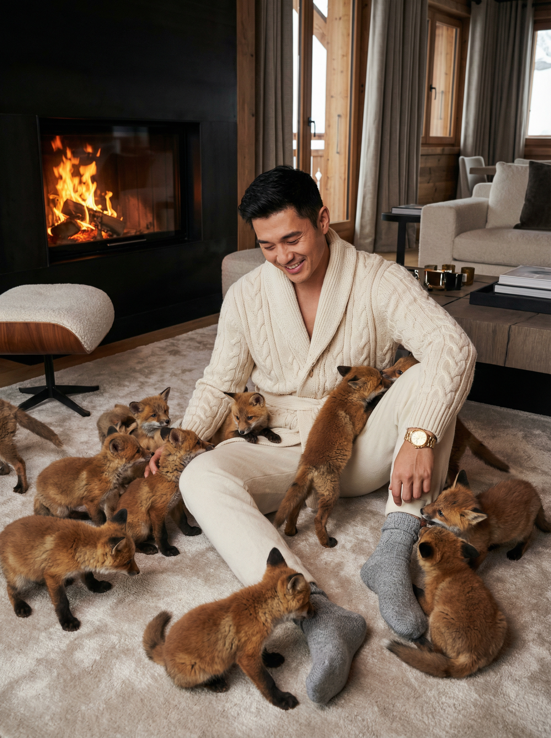 model in luxury knit set, relaxed robe cardigan, warm socks, minimal jewelry in a modern mountain chalet living room with a roaring fireplace and designer furniture, 15 red fox kits tumbling and play-fighting around the model on a plush rug, warm firelight, cozy-but-high-fashion editorial mood, ultra realistic