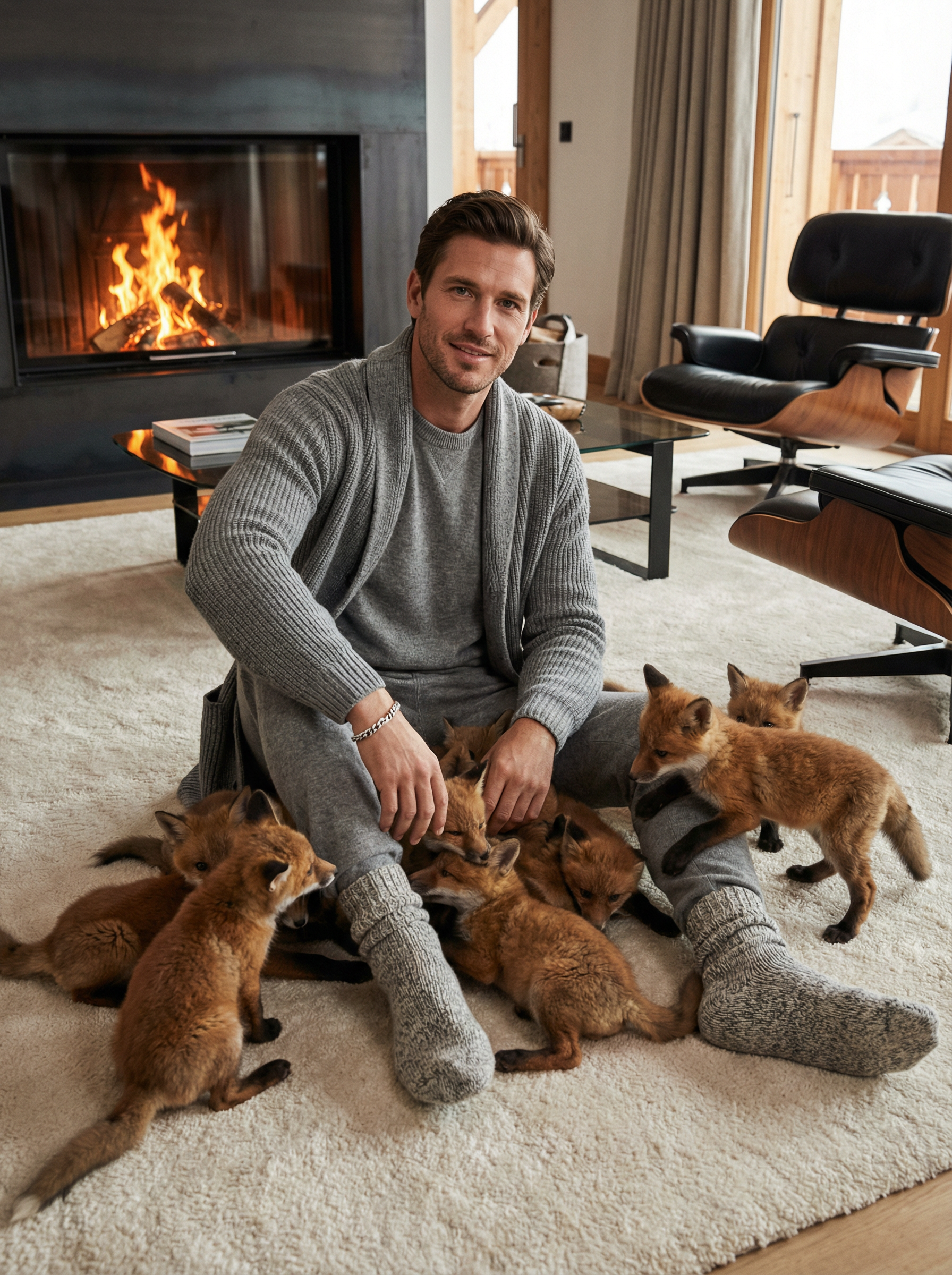 model in luxury knit set, relaxed robe cardigan, warm socks, minimal jewelry in a modern mountain chalet living room with a roaring fireplace and designer furniture, 15 red fox kits tumbling and play-fighting around the model on a plush rug, warm firelight, cozy-but-high-fashion editorial mood, ultra realistic