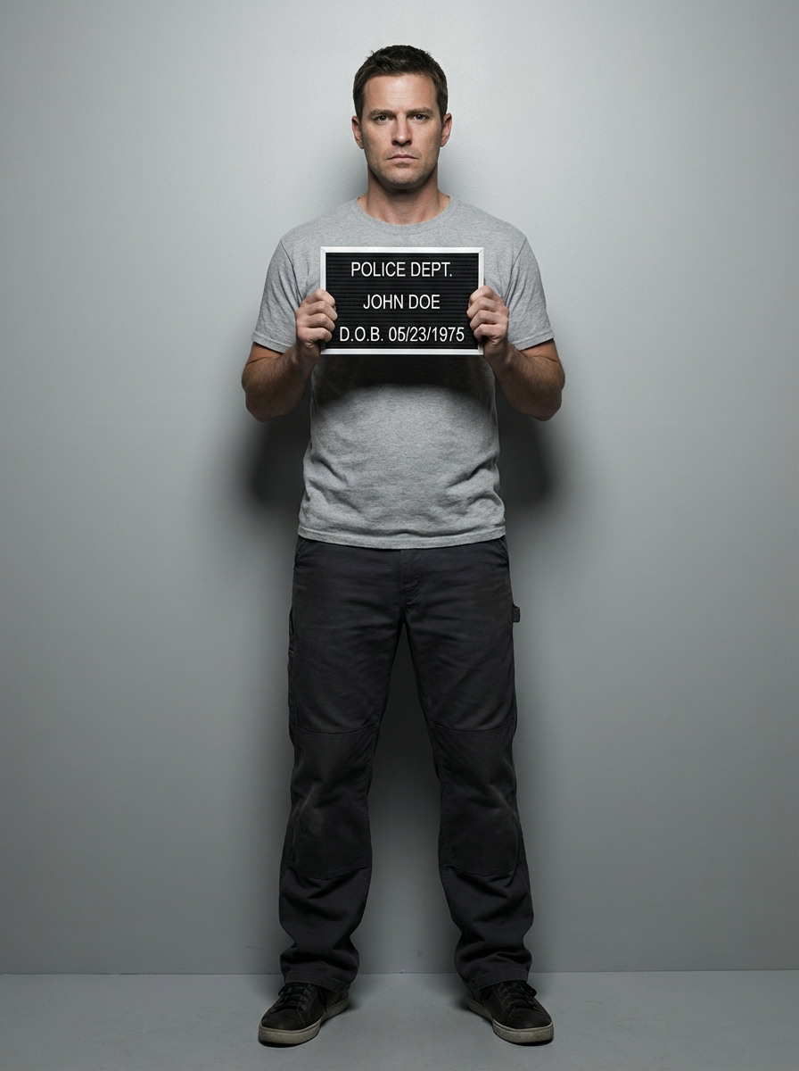 model in mugshot style photo, holding booking sign, serious expression, plain gray background, harsh overhead lighting, front view