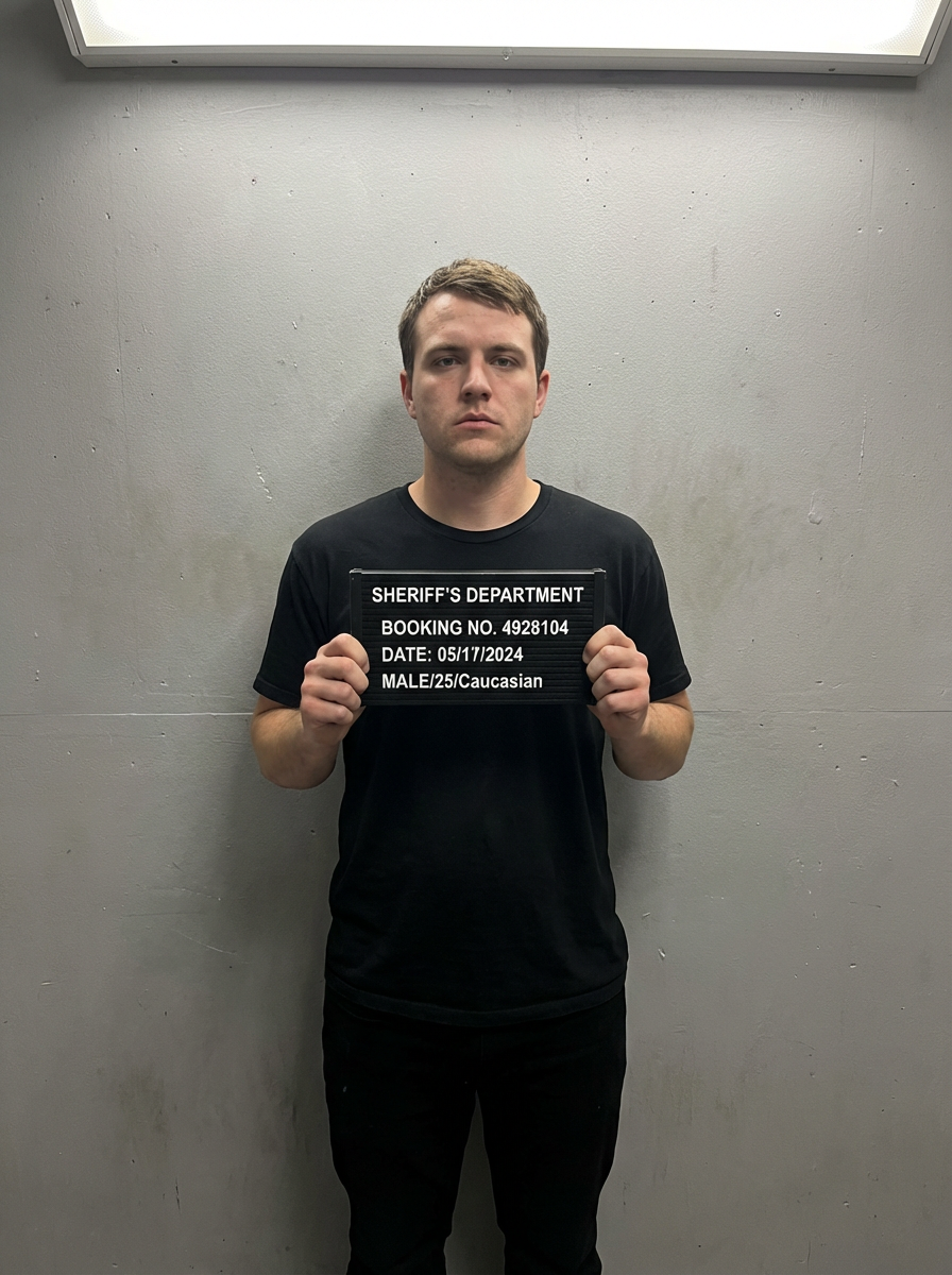 model in mugshot style photo, holding booking sign, serious expression, plain gray background, harsh overhead lighting, front view