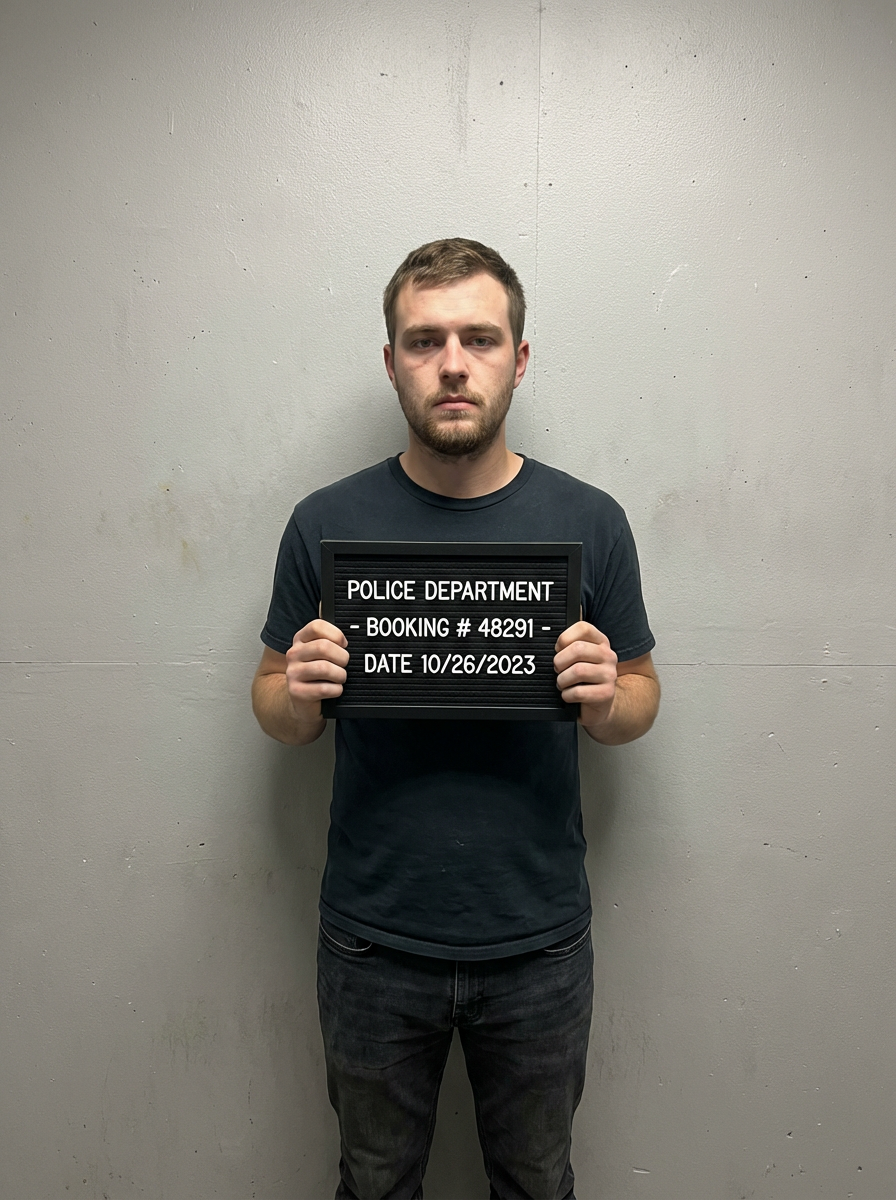 model in mugshot style photo, holding booking sign, serious expression, plain gray background, harsh overhead lighting, front view
