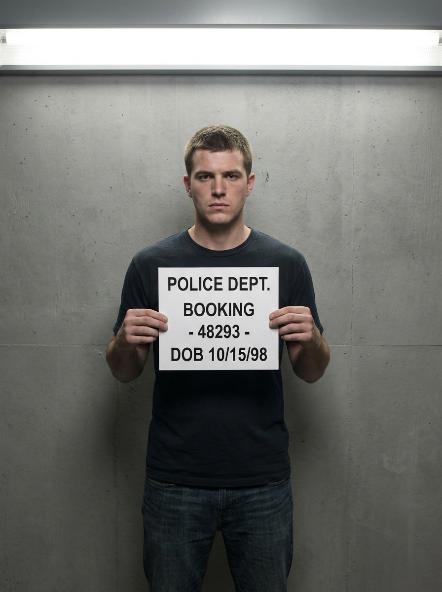 model in mugshot style photo, holding booking sign, serious expression, plain gray background, harsh overhead lighting, front view