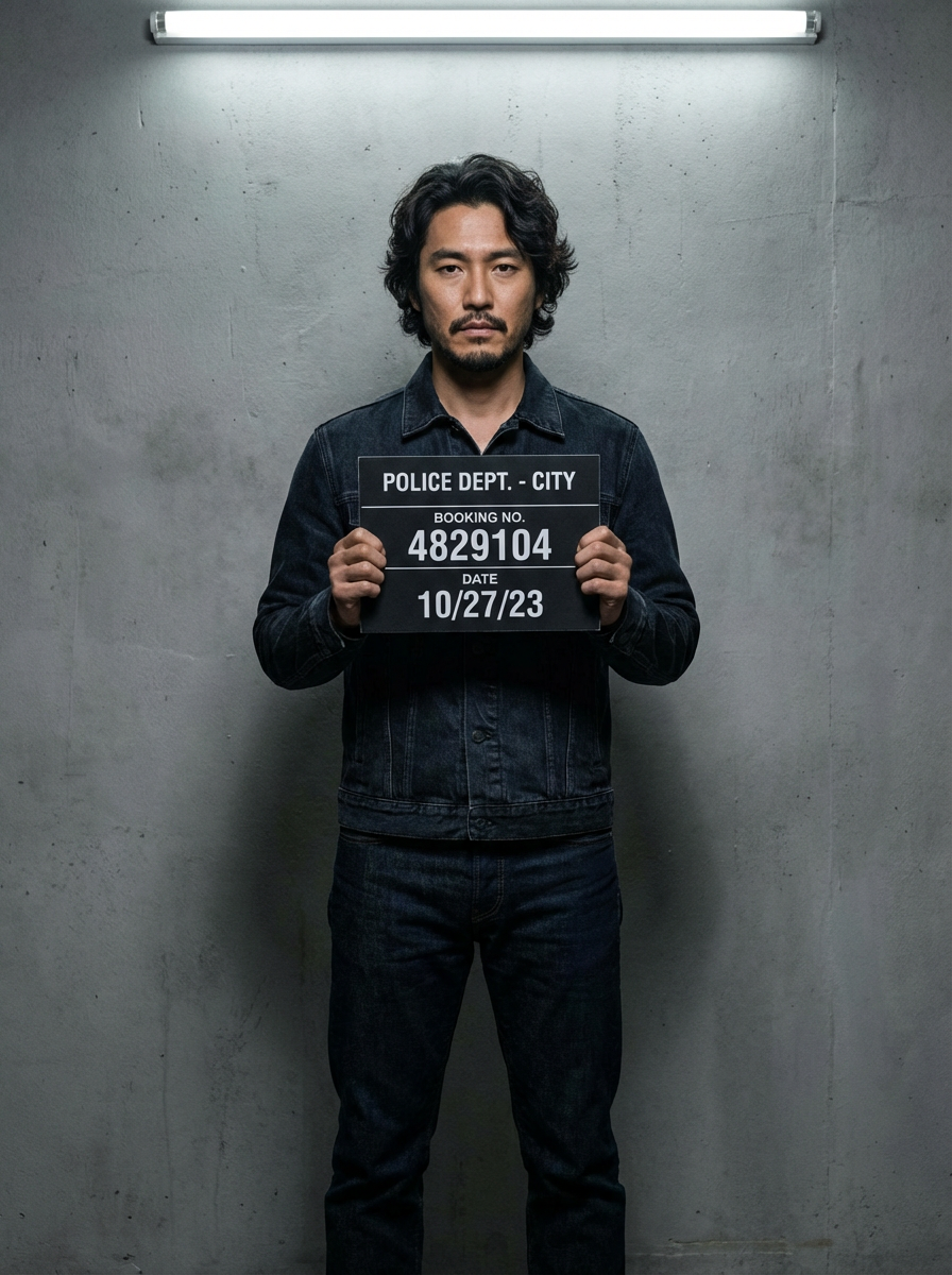 model in mugshot style photo, holding booking sign, serious expression, plain gray background, harsh overhead lighting, front view