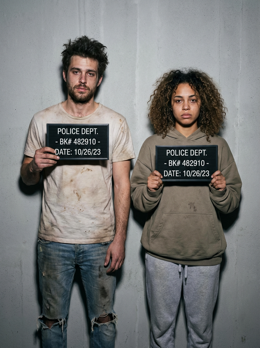 model in mugshot with messy appearance, just arrested look, harsh flash photography, gray background