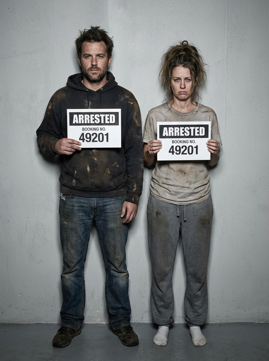 model in mugshot with messy appearance, just arrested look, harsh flash photography, gray background