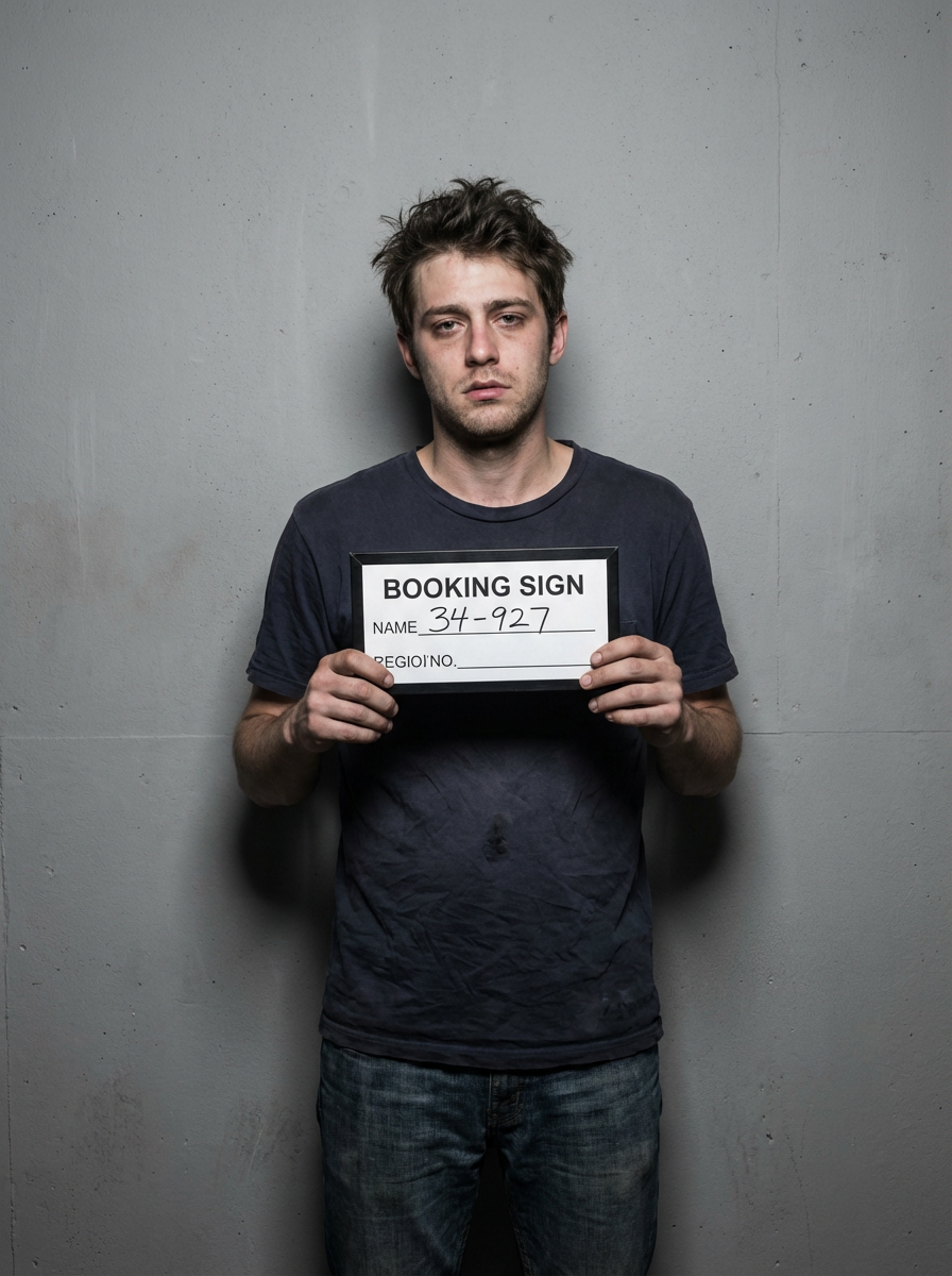 model in mugshot with messy appearance, just arrested look, harsh flash photography, gray background