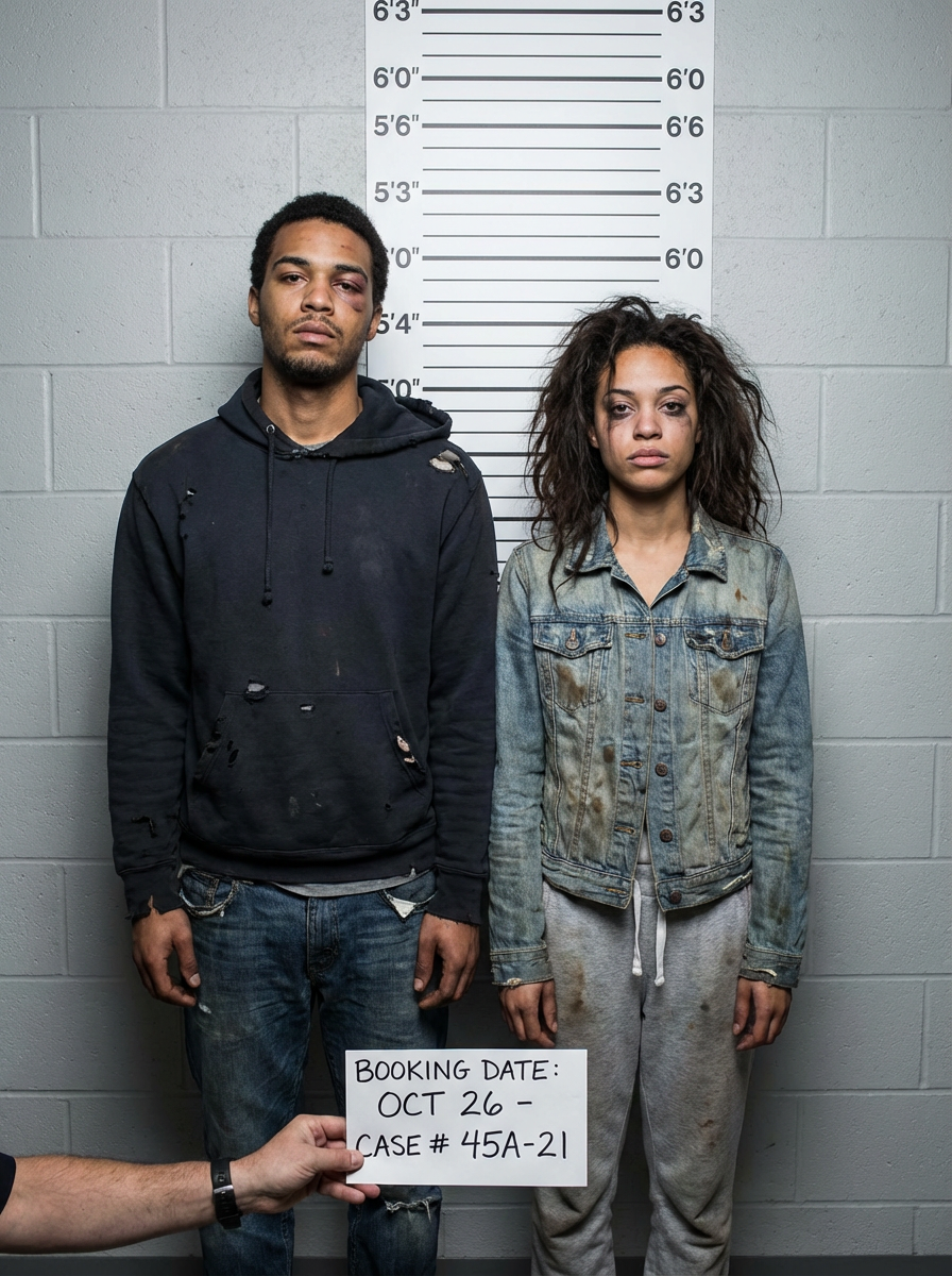model in mugshot with messy appearance, just arrested look, harsh flash photography, gray background