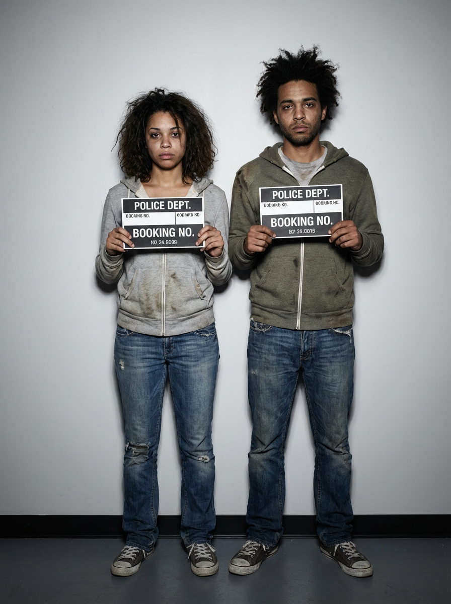 model in mugshot with messy appearance, just arrested look, harsh flash photography, gray background