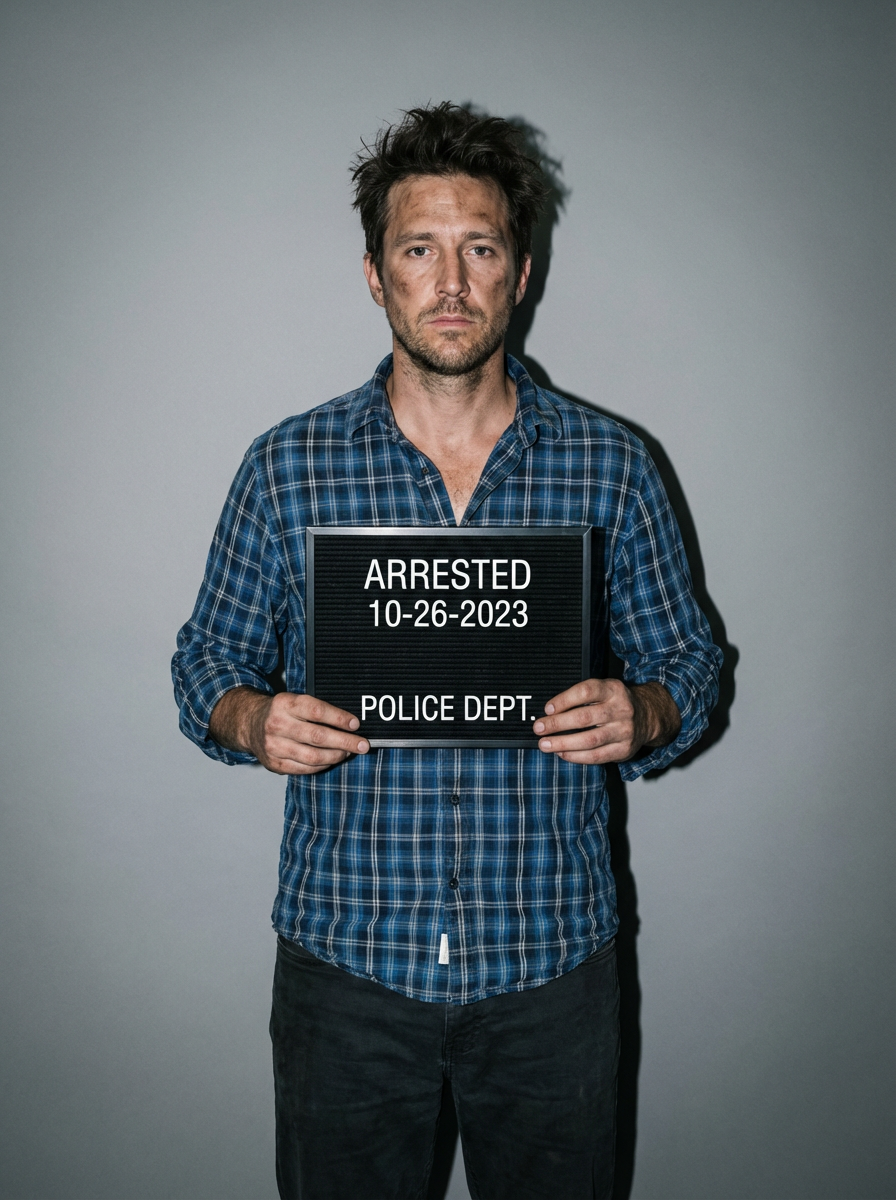 model in mugshot with messy appearance, just arrested look, harsh flash photography, gray background