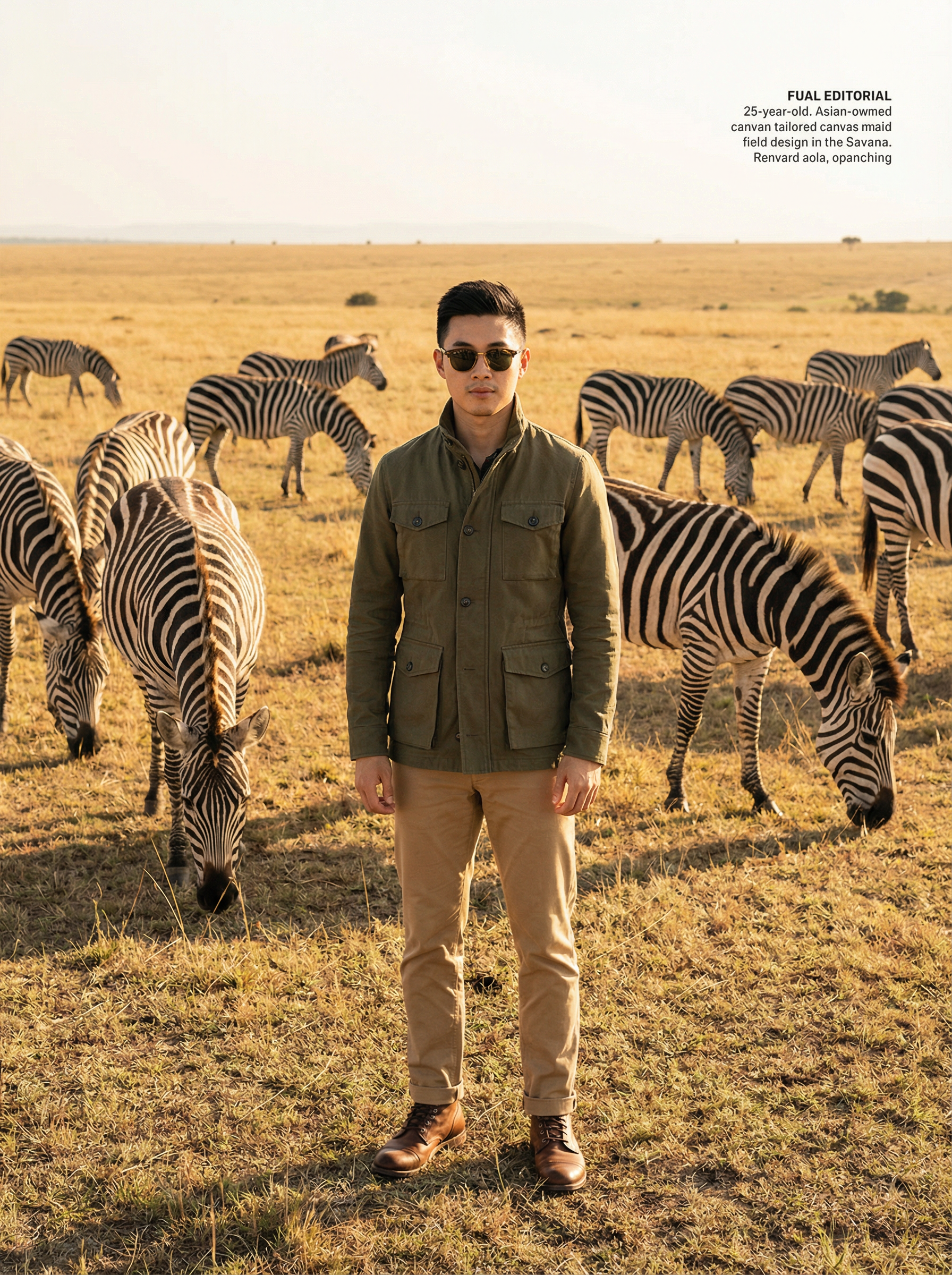model in neutral safari-luxe: tailored field jacket, trousers, boots, sunglasses on an open savanna-style landscape staged like a fashion campaign, 15 zebras grazing peacefully around the model, golden afternoon light, magazine editorial composition, crisp realism