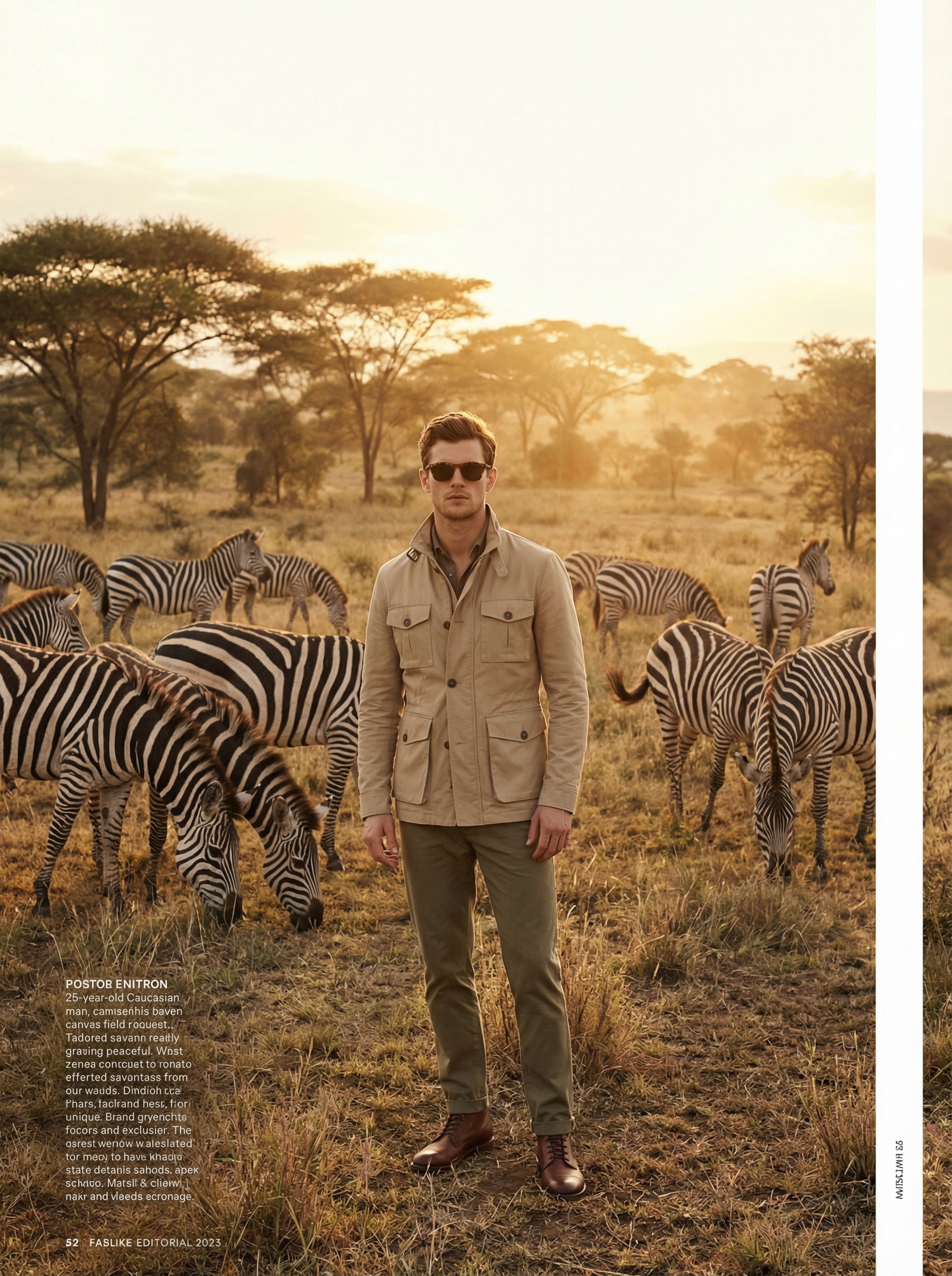 model in neutral safari-luxe: tailored field jacket, trousers, boots, sunglasses on an open savanna-style landscape staged like a fashion campaign, 15 zebras grazing peacefully around the model, golden afternoon light, magazine editorial composition, crisp realism