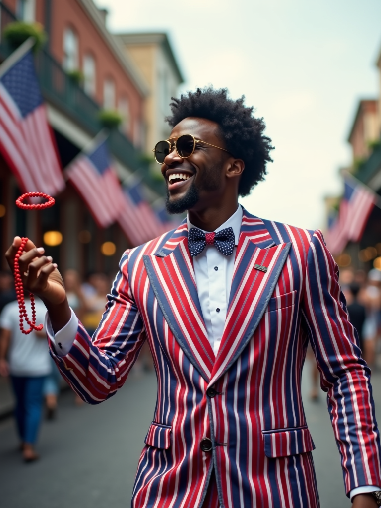 model in New Orleans during Mardi Gras, wearing a stars and stripes suit with patriotic bow tie, throwing red, white, and blue beads to the crowd, American flags lining Bourbon Street