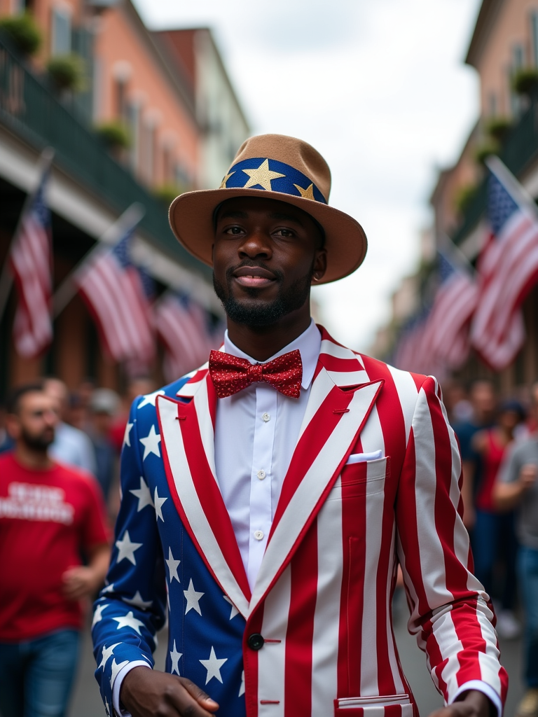 model in New Orleans during Mardi Gras, wearing a stars and stripes suit with patriotic bow tie, throwing red, white, and blue beads to the crowd, American flags lining Bourbon Street