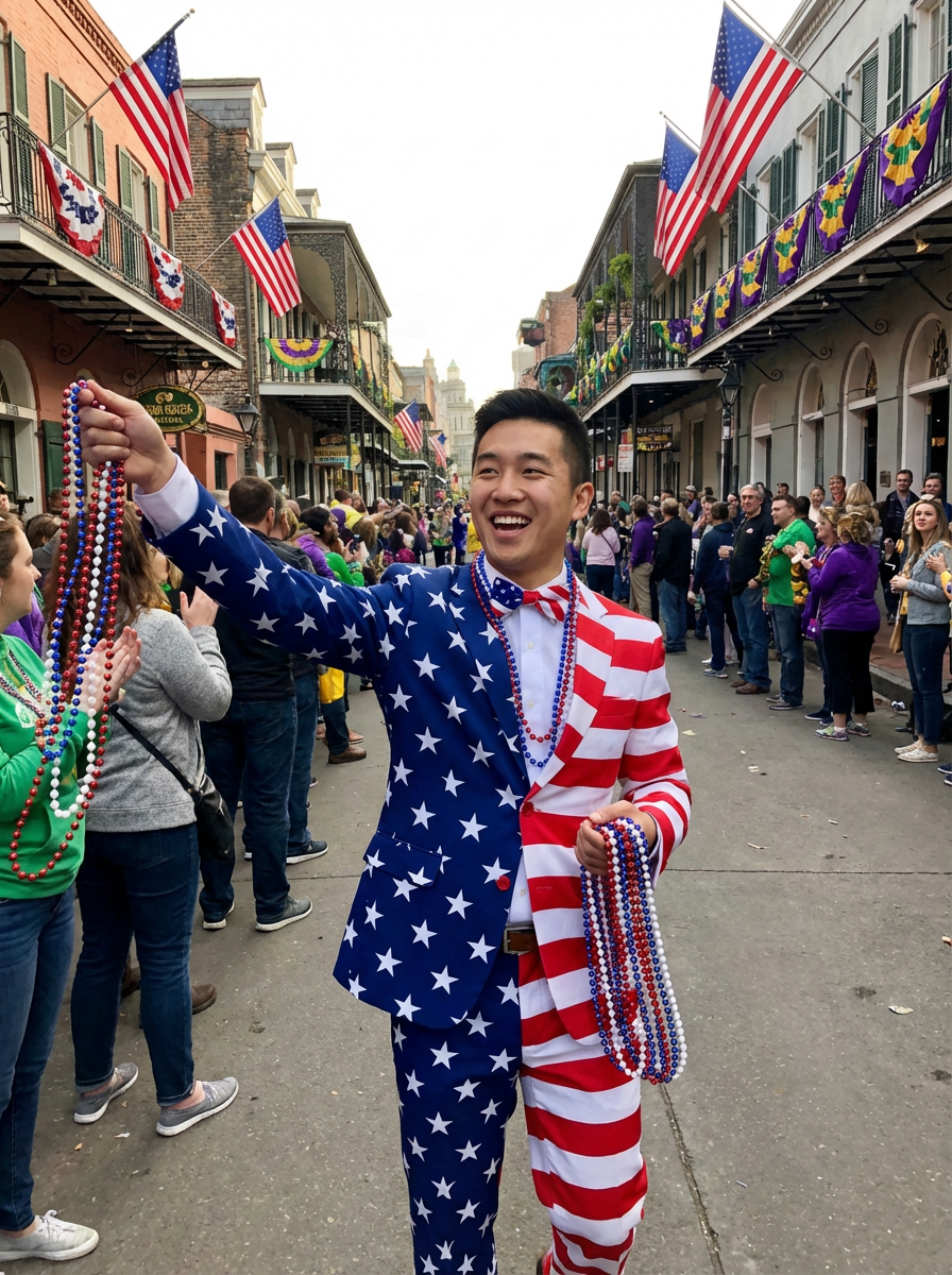 model in New Orleans during Mardi Gras, wearing a stars and stripes suit with patriotic bow tie, throwing red, white, and blue beads to the crowd, American flags lining Bourbon Street
