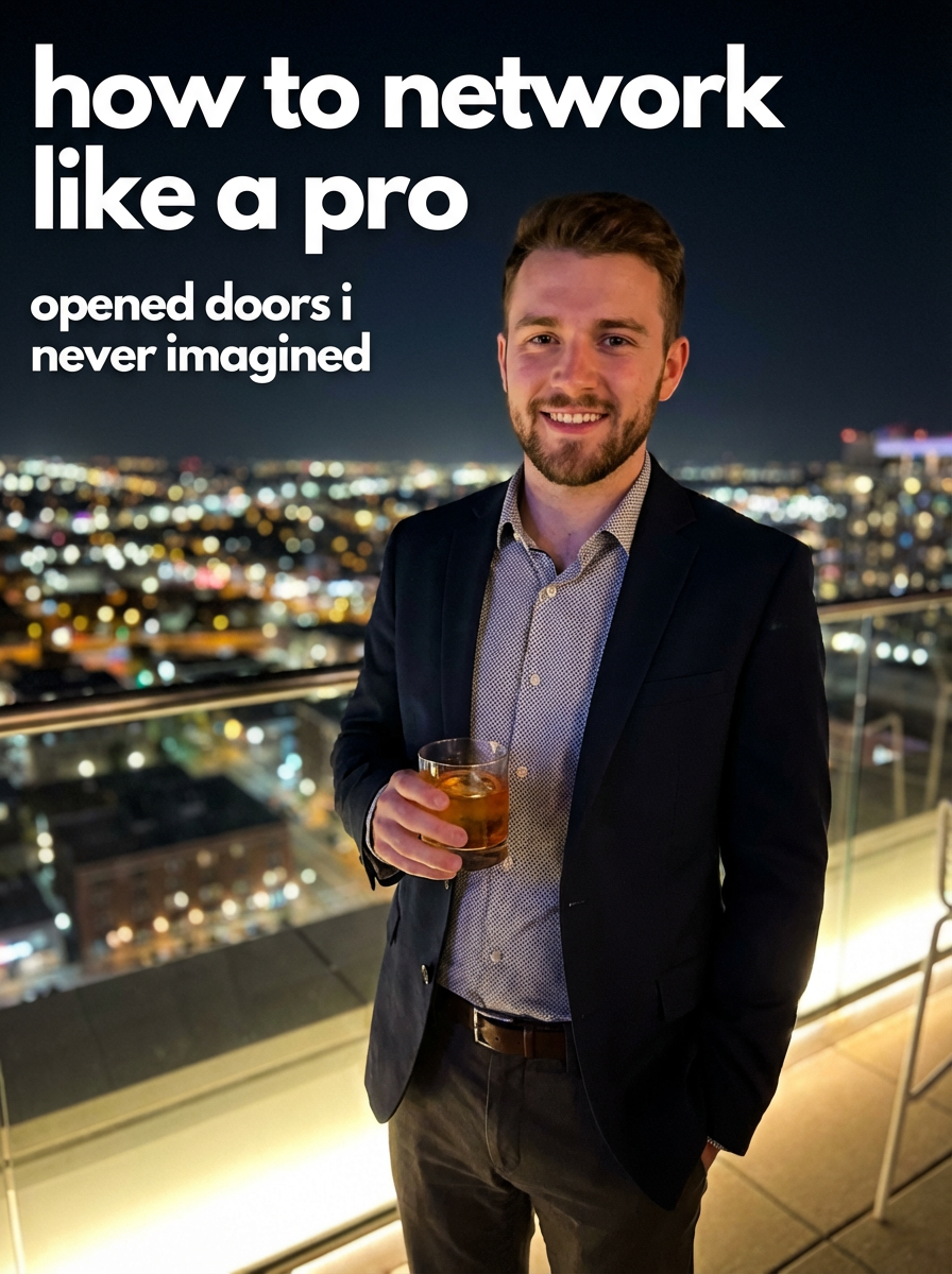 model in night out outfit at rooftop bar, city lights in background, holding cocktail, confident pose. TikTok text overlay: "how to network like a pro" smaller text: "(opened doors i never imagined)", do not show tiktok interface