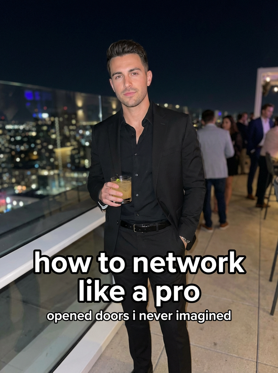 model in night out outfit at rooftop bar, city lights in background, holding cocktail, confident pose. TikTok TikTok-style text overlay with white text with black outline: "how to network like a pro" smaller text: "(opened doors i never imagined)", do not show tiktok interface or logo