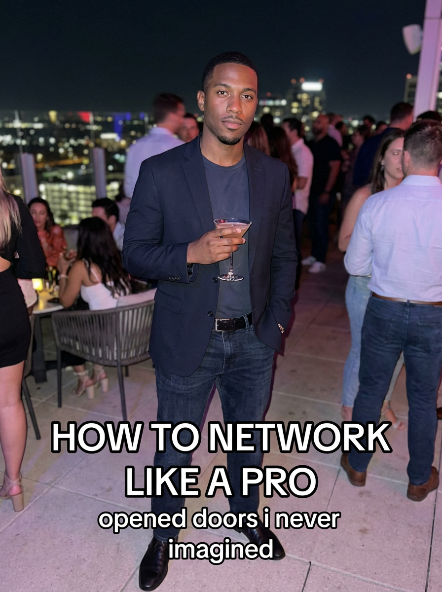model in night out outfit at rooftop bar, city lights in background, holding cocktail, confident pose. TikTok TikTok-style text overlay with white text with black outline: "how to network like a pro" smaller text: "(opened doors i never imagined)", do not show tiktok interface or logo