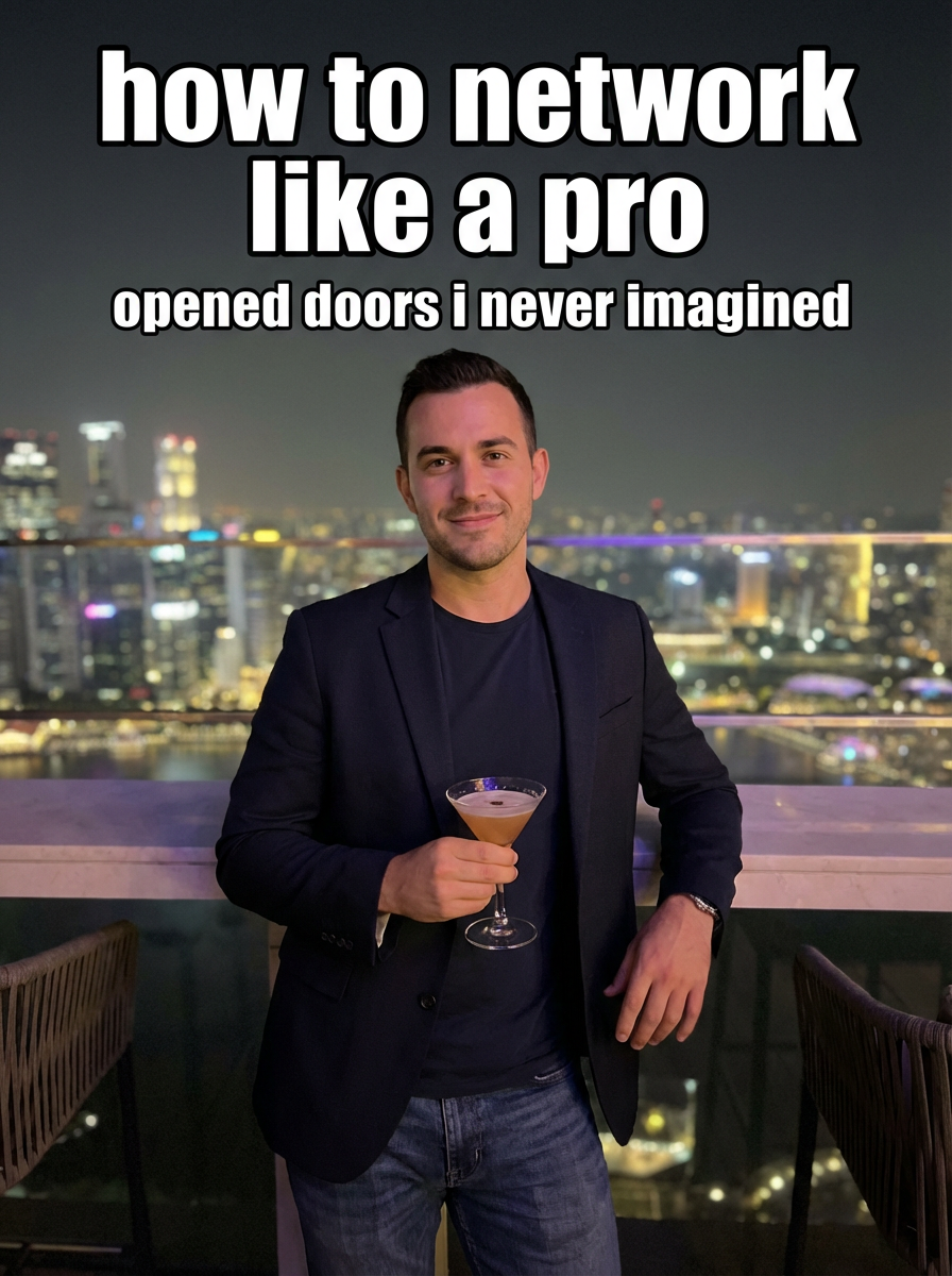 model in night out outfit at rooftop bar, city lights in background, holding cocktail, confident pose. TikTok-style text overlay with white text with black outline: "how to network like a pro" smaller text: "(opened doors i never imagined)", do not show tiktok interface or logo