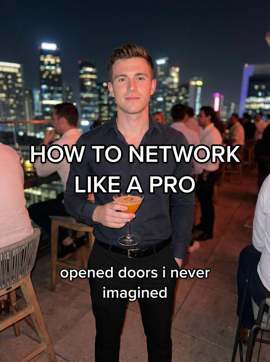 model in night out outfit at rooftop bar, city lights in background, holding cocktail, confident pose. TikTok-style text overlay with white text with black outline: "how to network like a pro" smaller text: "(opened doors i never imagined)", do not show tiktok interface or logo