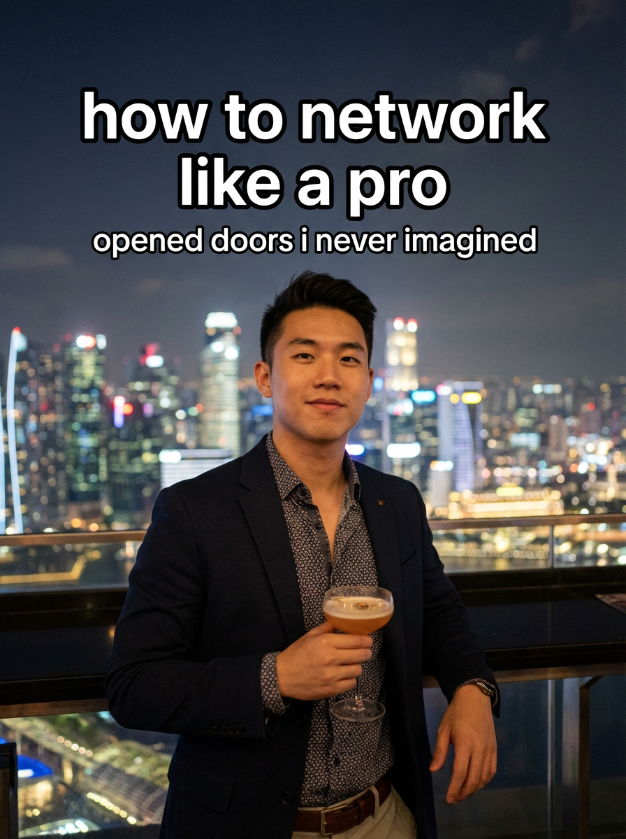 model in night out outfit at rooftop bar, city lights in background, holding cocktail, confident pose. TikTok-style text overlay with white text with black outline: "how to network like a pro" smaller text: "(opened doors i never imagined)", do not show tiktok interface or logo
