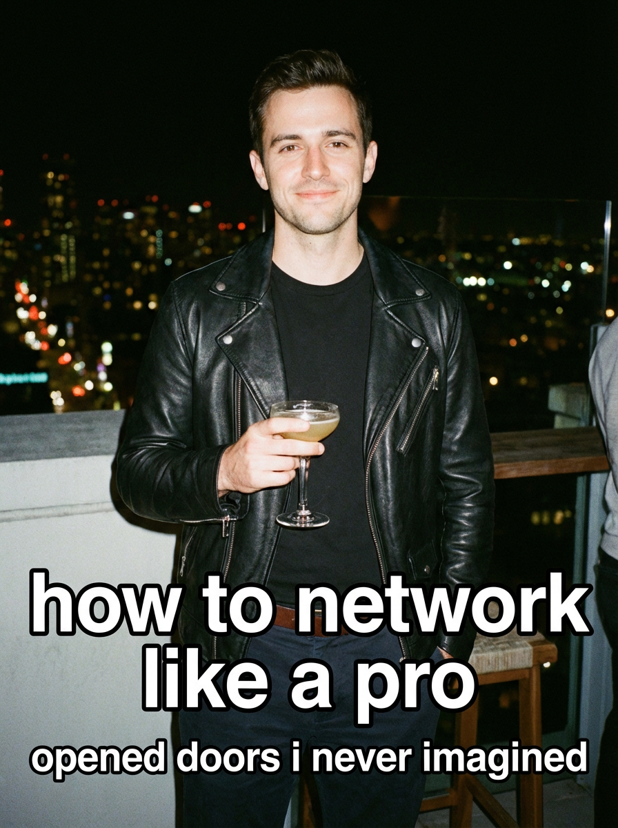 model in night out outfit at rooftop bar, city lights in background, holding cocktail, confident pose. TikTok-style text overlay with white text with black outline: "how to network like a pro" smaller text: "(opened doors i never imagined)", do not show tiktok interface or logo