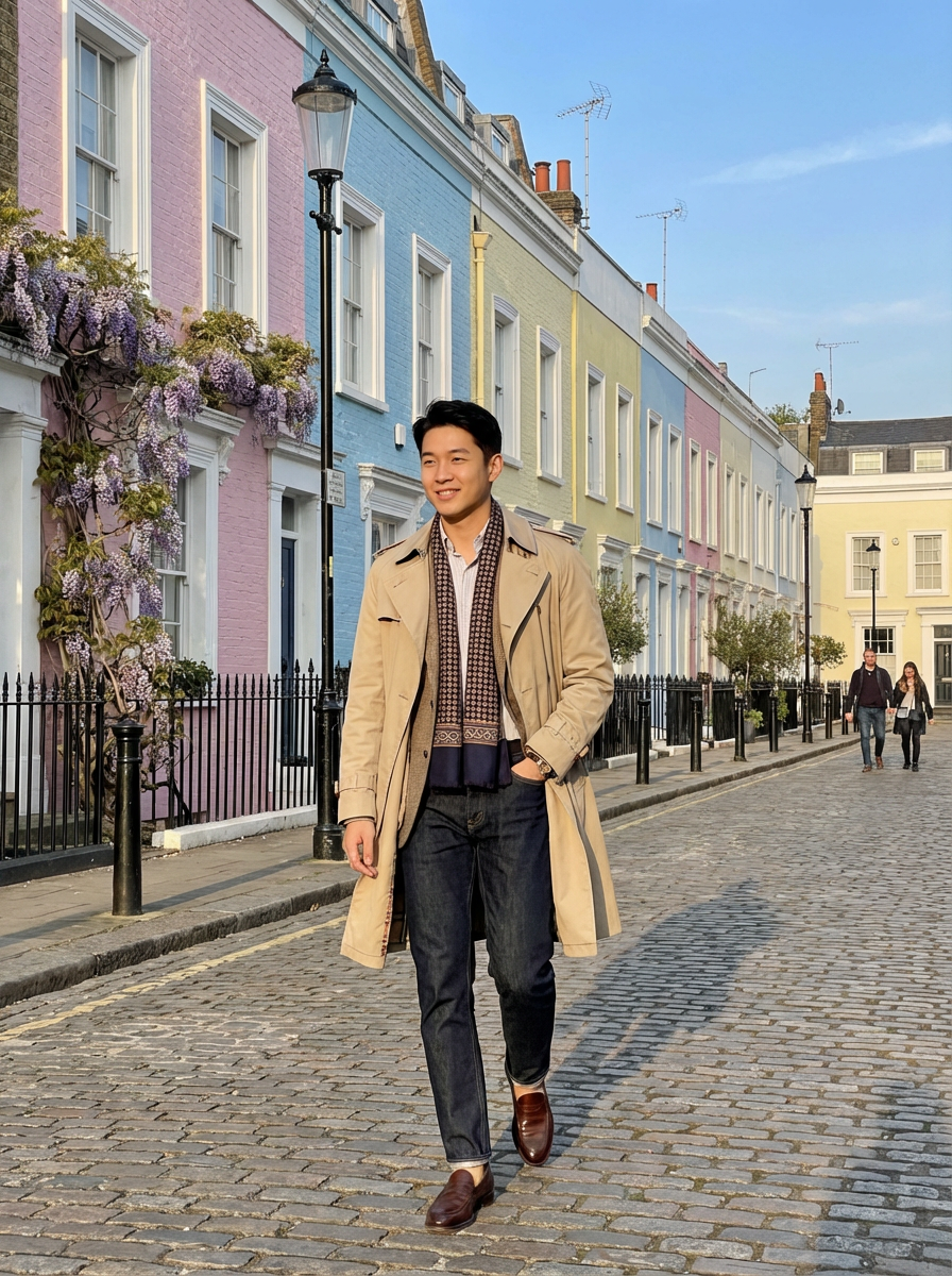 model in Notting Hill, colorful pastel houses, charming street scene, fashionable outfit, sunny day