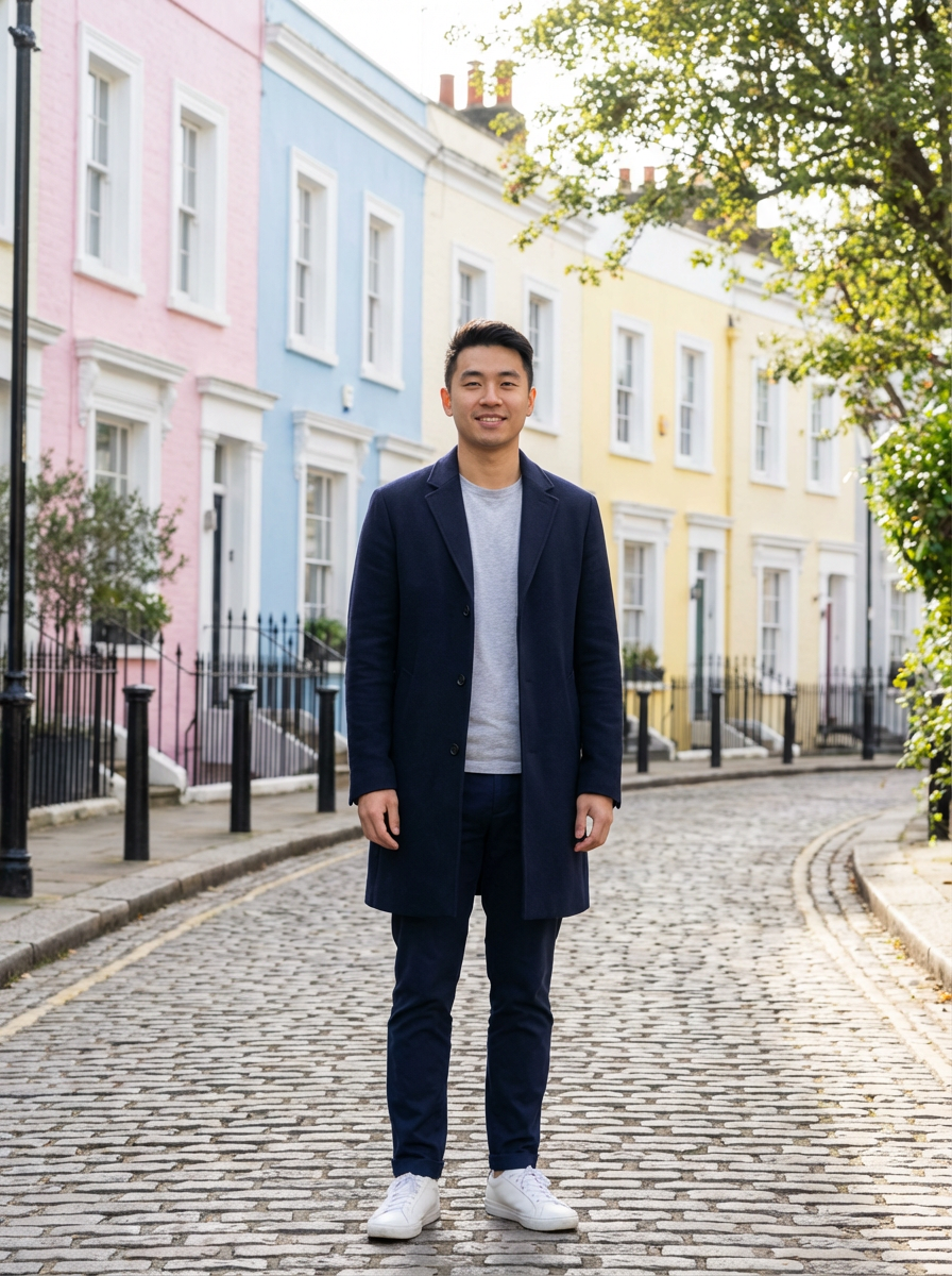 model in Notting Hill, colorful pastel houses, charming street scene, fashionable outfit, sunny day