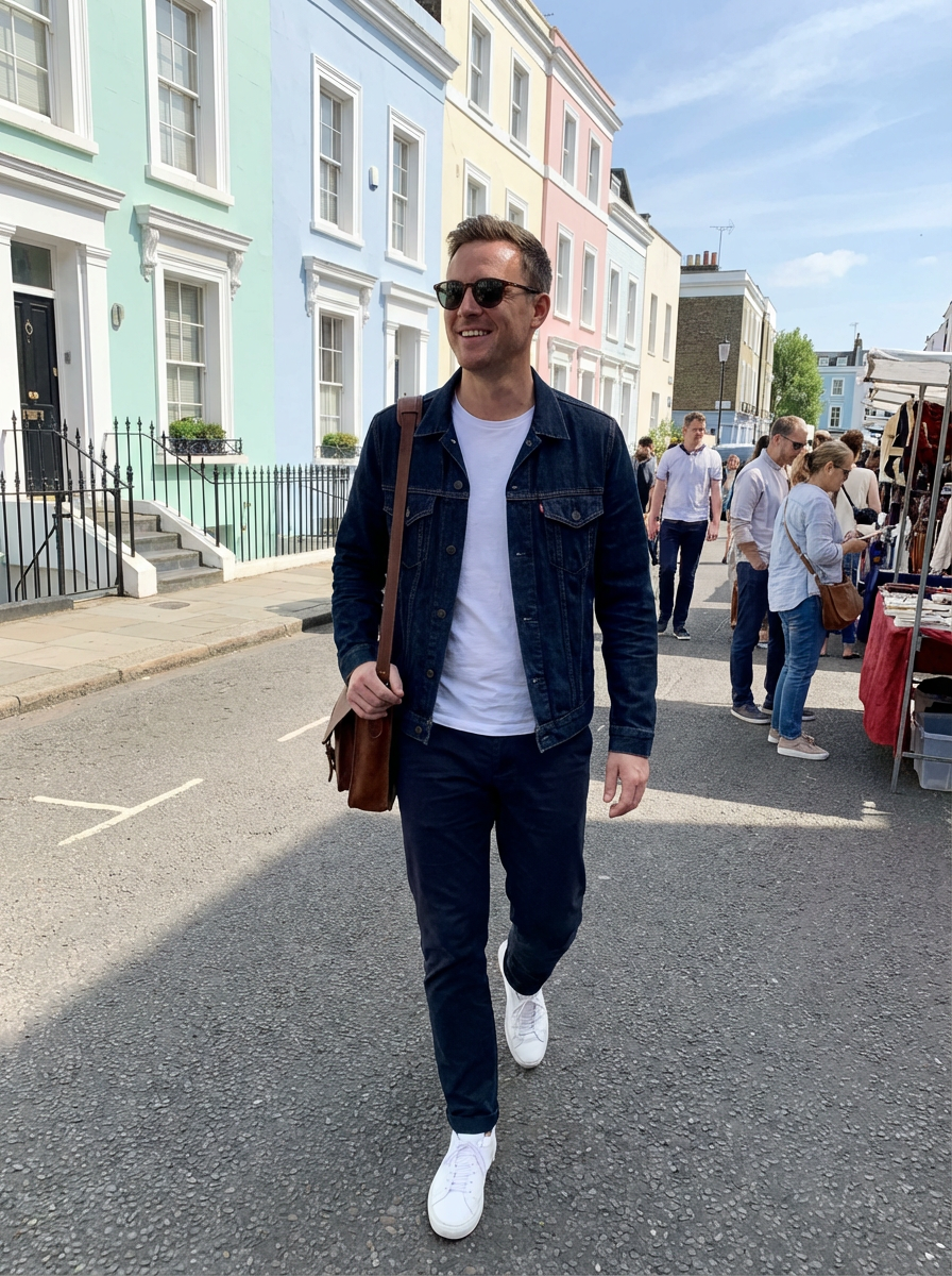 model in Notting Hill, colorful pastel houses, charming street scene, fashionable outfit, sunny day