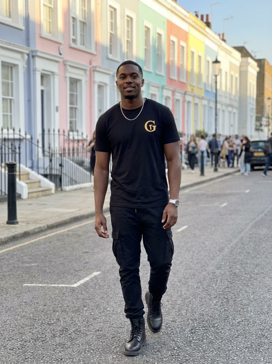 model in Notting Hill, colorful pastel houses, charming street scene, fashionable outfit, sunny day
