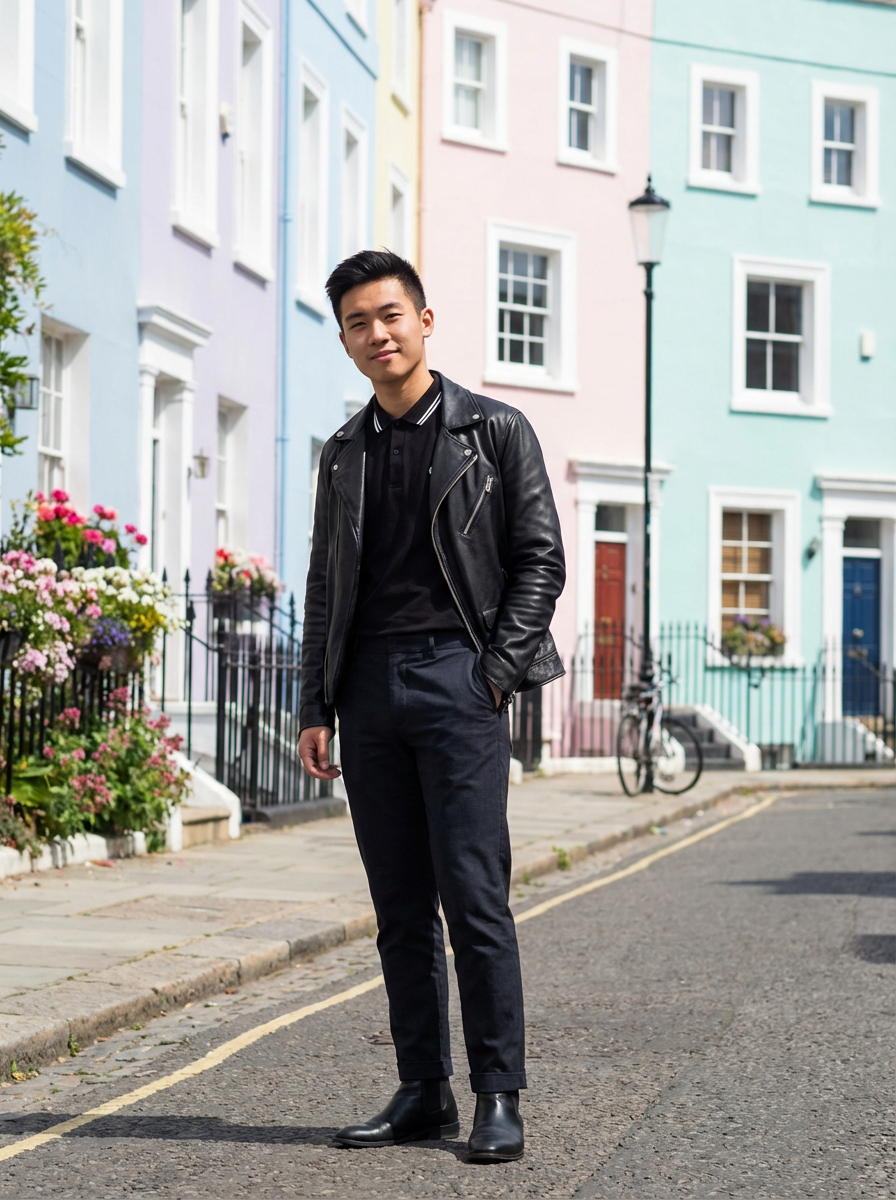 model in Notting Hill, colorful pastel houses, charming street scene, fashionable outfit, sunny day