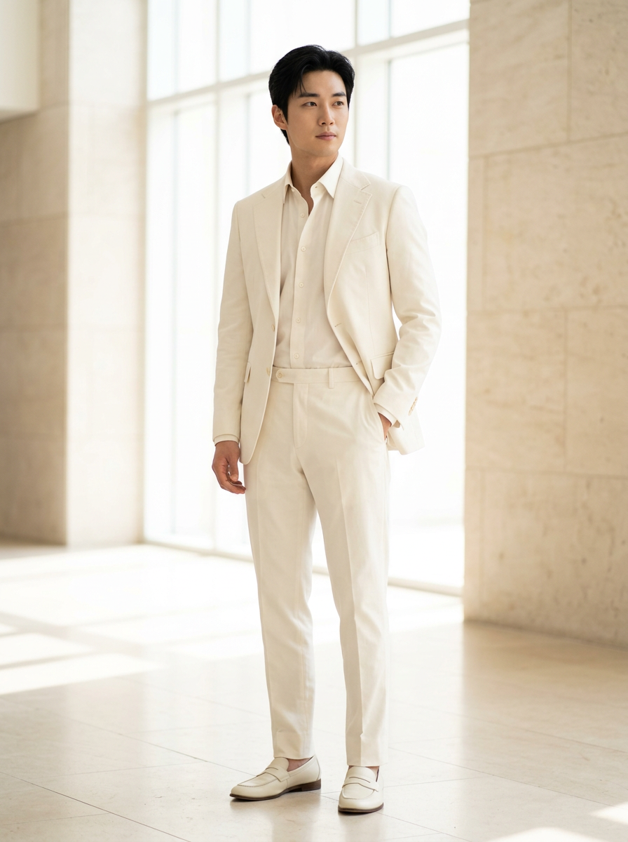 model in off-white cotton suit with ivory shirt, all-white monochromatic look, elegant and airy, bright natural daylight