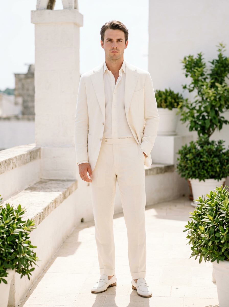 model in off-white cotton suit with ivory shirt, all-white monochromatic look, elegant and airy, bright natural daylight