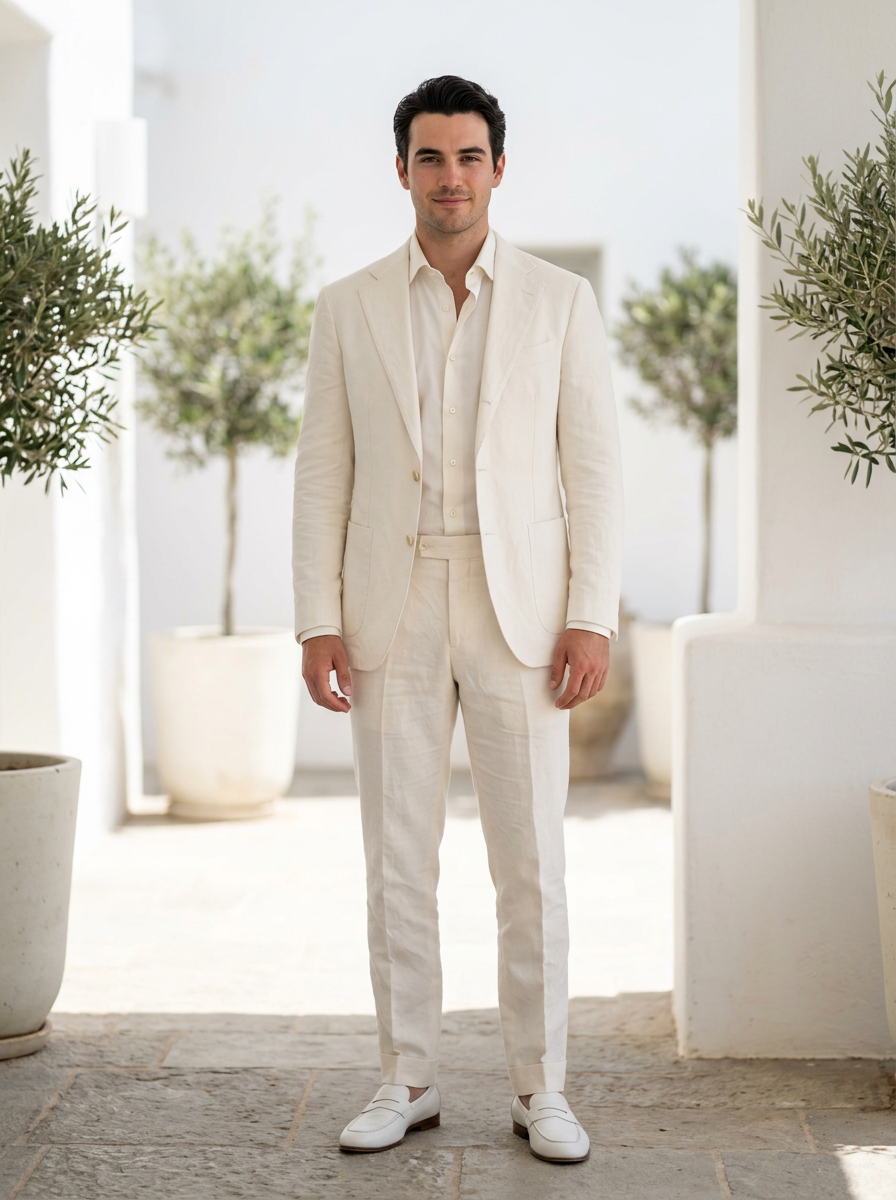 model in off-white cotton suit with ivory shirt, all-white monochromatic look, elegant and airy, bright natural daylight