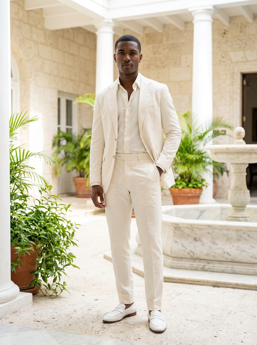 model in off-white cotton suit with ivory shirt, all-white monochromatic look, elegant and airy, bright natural daylight
