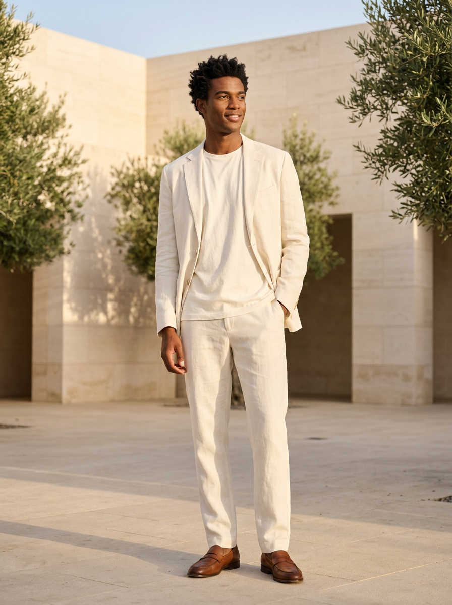 model in off-white linen blazer over ivory t-shirt, refined minimalist style, soft neutral palette, golden hour lighting