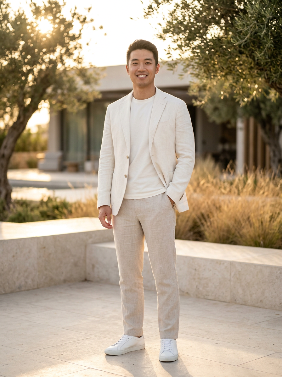 model in off-white linen blazer over ivory t-shirt, refined minimalist style, soft neutral palette, golden hour lighting