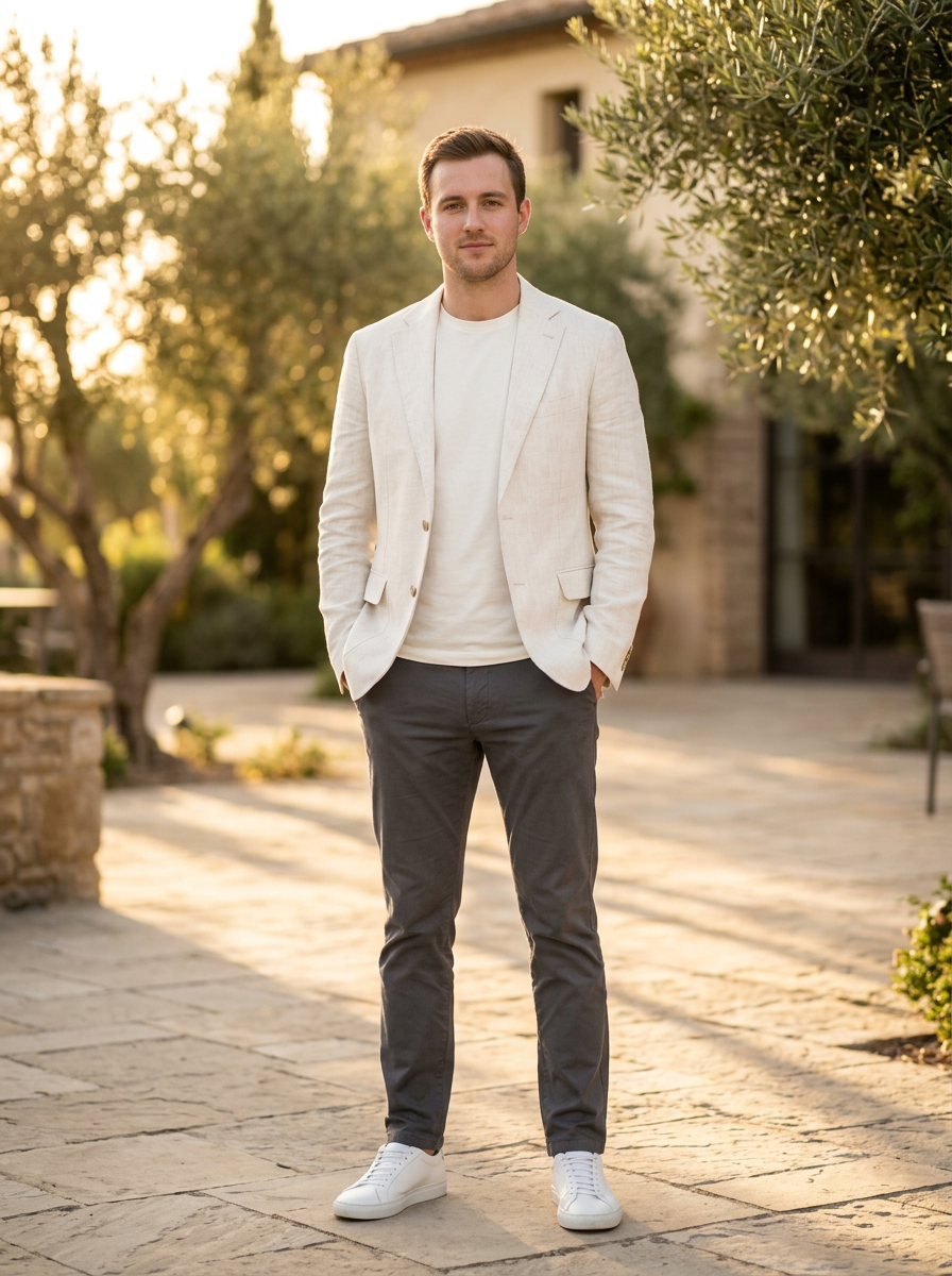 model in off-white linen blazer over ivory t-shirt, refined minimalist style, soft neutral palette, golden hour lighting