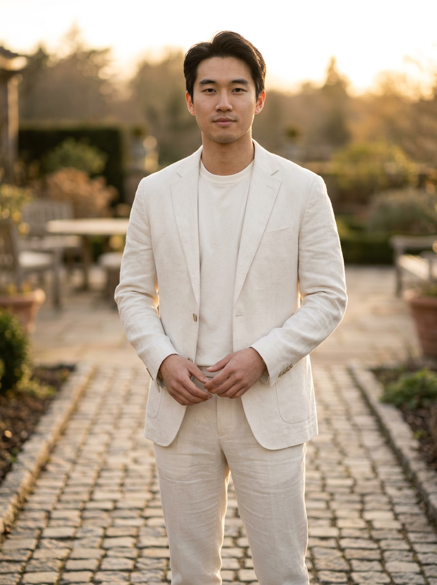 model in off-white linen blazer over ivory t-shirt, refined minimalist style, soft neutral palette, golden hour lighting