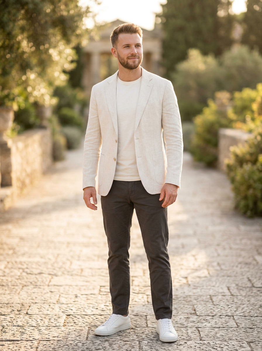model in off-white linen blazer over ivory t-shirt, refined minimalist style, soft neutral palette, golden hour lighting