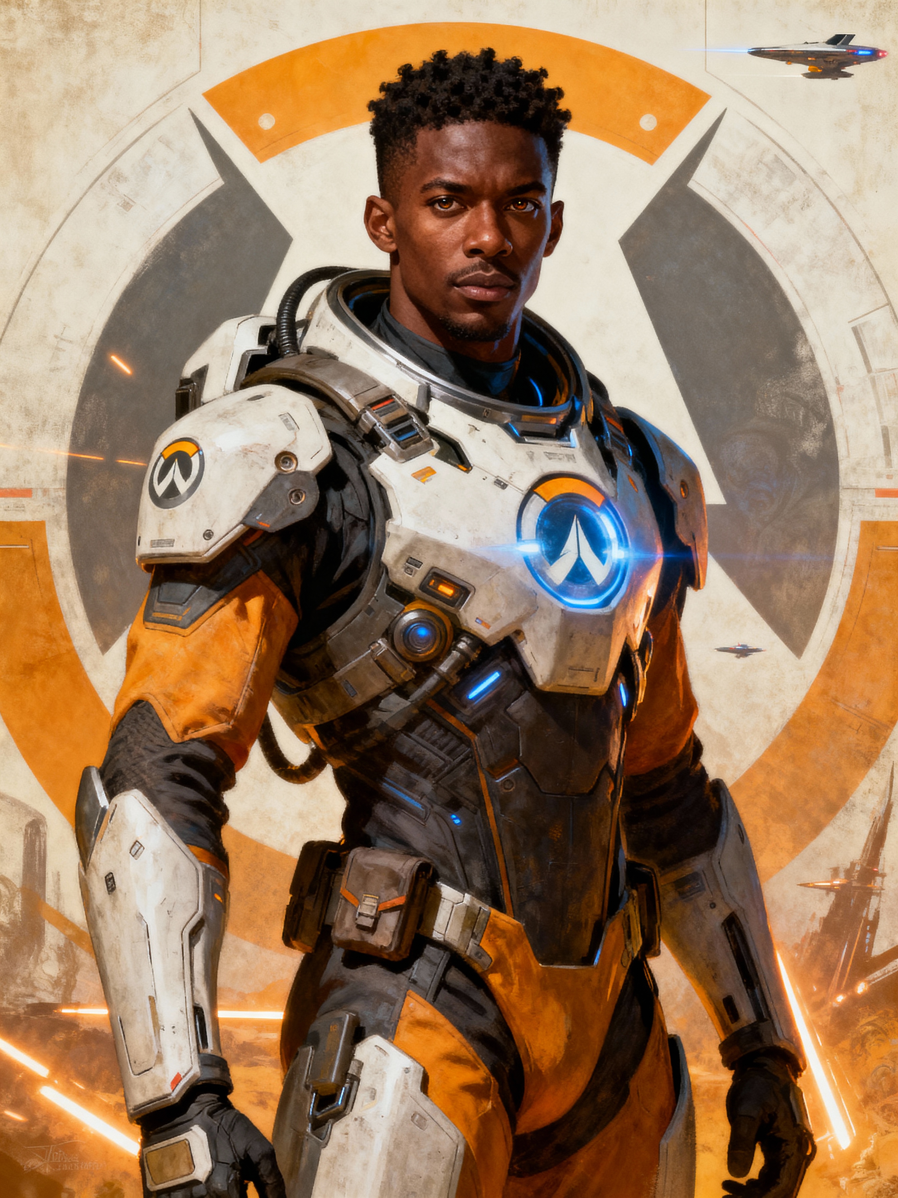 model in Overwatch, character shot, shot, concept art, intricate details, highly detailed, vintage sci - fi poster, retro future, in the style of chris foss, rodger dean, moebius, michael whelan, and gustave dore