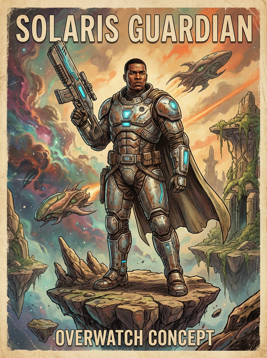 model in Overwatch, character shot, shot, concept art, intricate details, highly detailed, vintage sci - fi poster, retro future, in the style of chris foss, rodger dean, moebius, michael whelan, and gustave dore