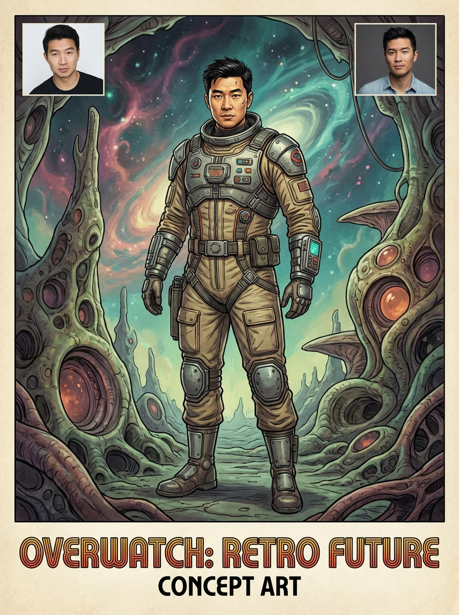model in Overwatch, character shot, shot, concept art, intricate details, highly detailed, vintage sci - fi poster, retro future, in the style of chris foss, rodger dean, moebius, michael whelan, and gustave dore