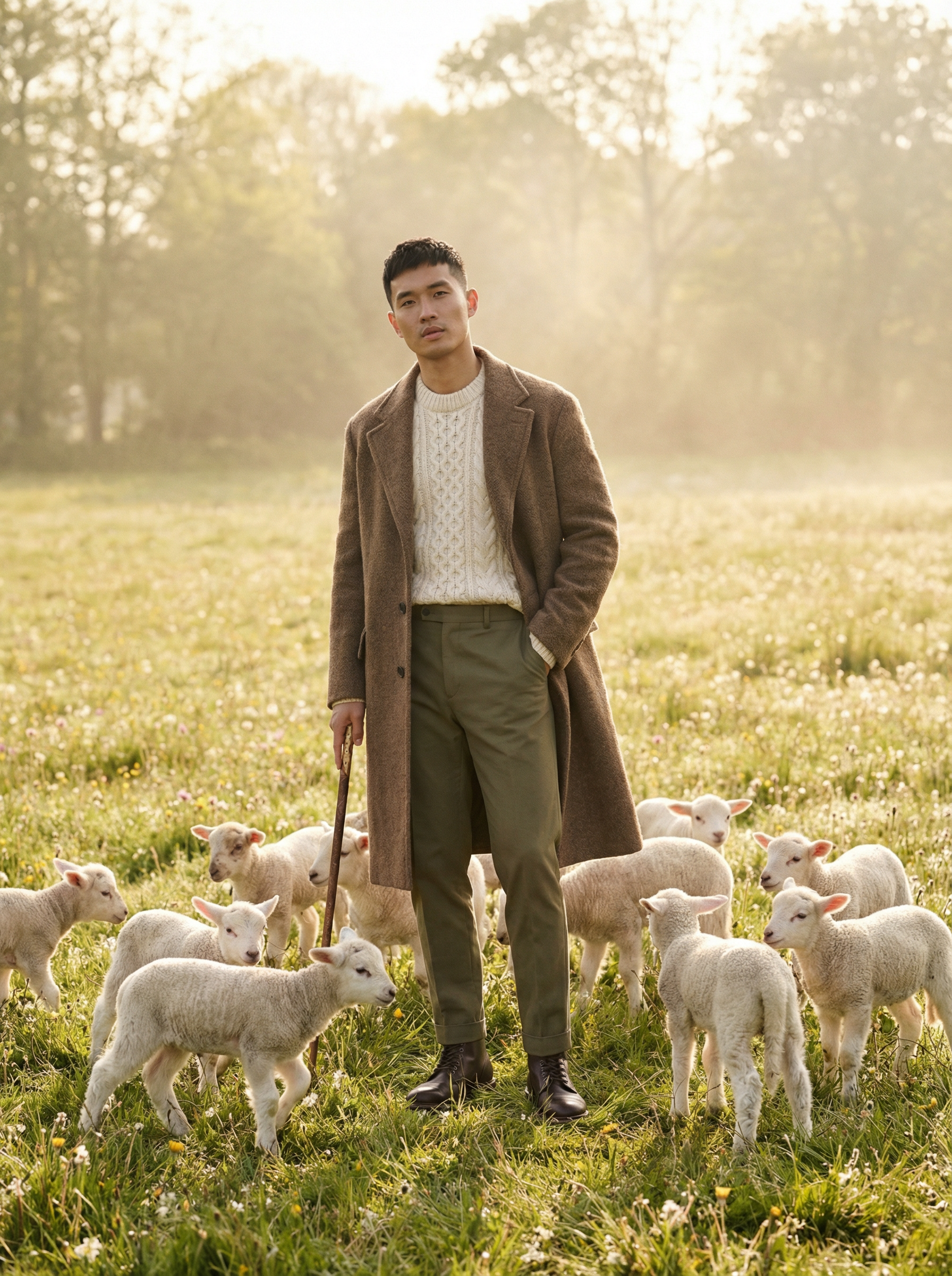 model in pastoral couture: cable-knit sweater, tailored trousers, boots, long coat in a dreamy meadow set like a fashion editorial, 15 lambs frolicking around the model, soft spring light, cinematic haze, ultra-realistic high-end campaign vibe