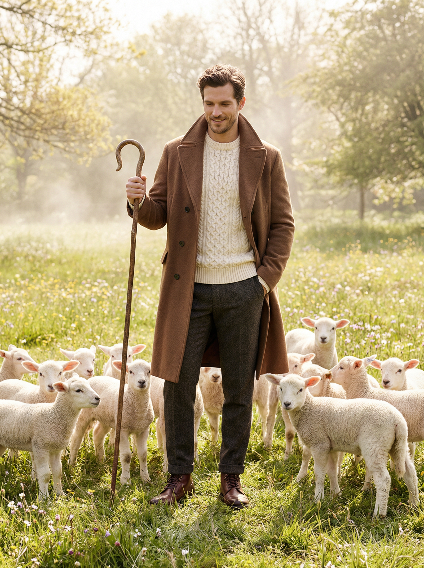 model in pastoral couture: cable-knit sweater, tailored trousers, boots, long coat in a dreamy meadow set like a fashion editorial, 15 lambs frolicking around the model, soft spring light, cinematic haze, ultra-realistic high-end campaign vibe