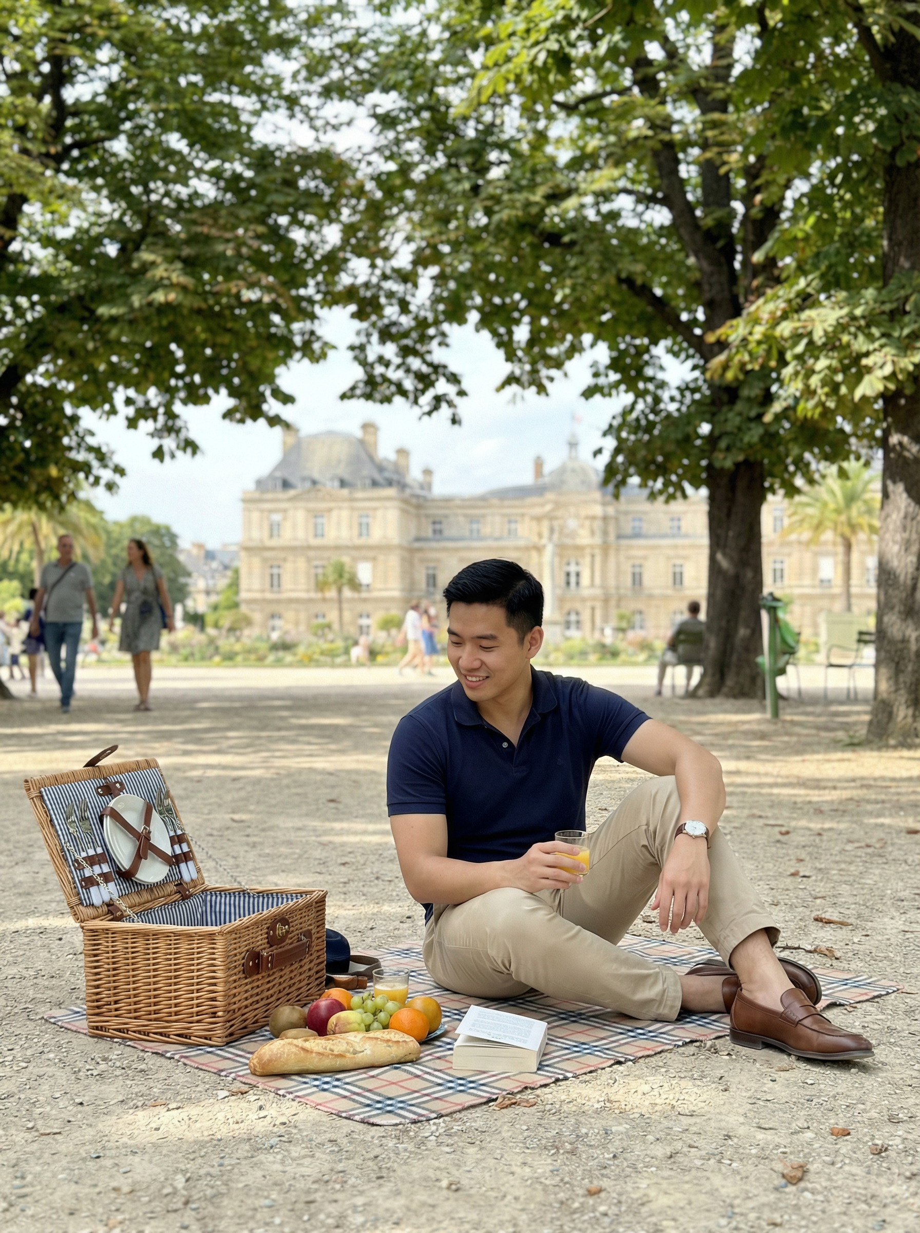 model in polo shirt, khakis, loafers, picnic basket having picnic in Luxembourg Gardens, manicured park setting, palace in background, peaceful garden atmosphere, dappled sunlight through trees, leisurely park day
