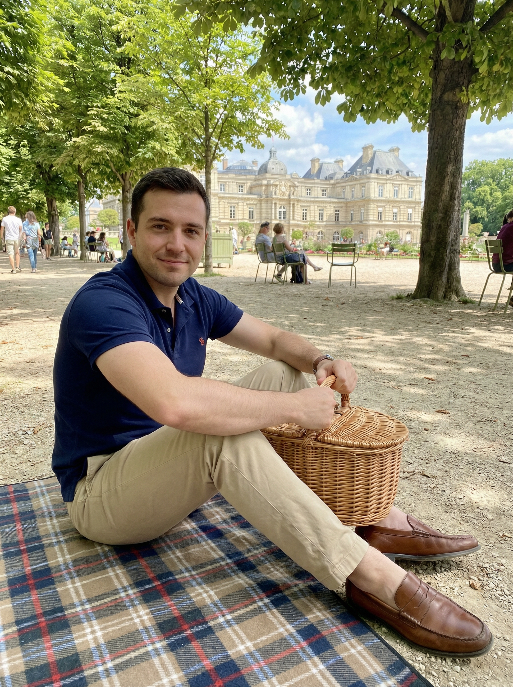 model in polo shirt, khakis, loafers, picnic basket having picnic in Luxembourg Gardens, manicured park setting, palace in background, peaceful garden atmosphere, dappled sunlight through trees, leisurely park day
