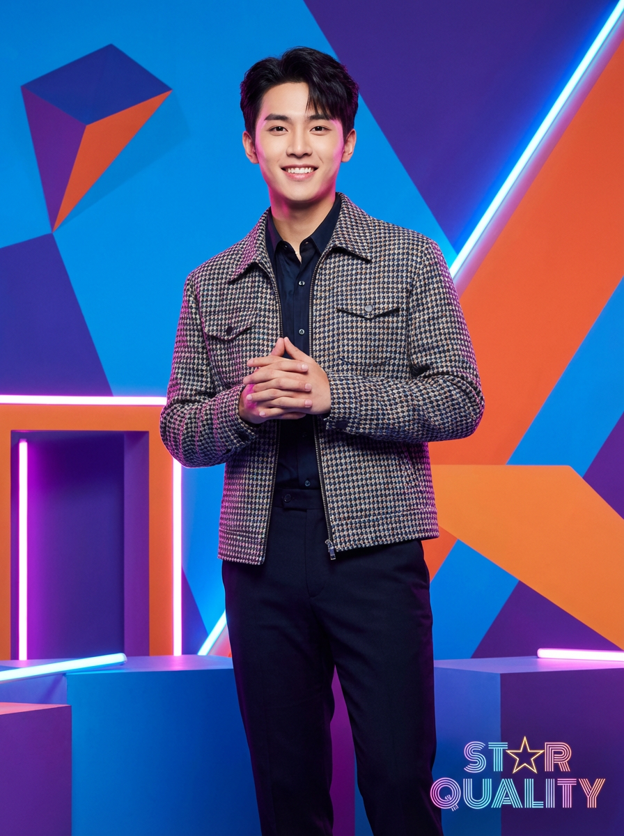 model in pop album cover style, colorful vibrant, confident star quality, professional photography