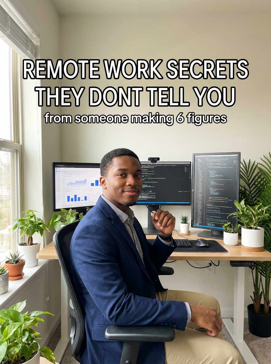 model in professional attire at home office setup, multiple monitors, plants, organized desk, natural lighting. TikTok-style text overlay with white text with black outline: "remote work secrets they dont tell you" smaller text: "(from someone making 6 figures)", do not show tiktok interface or logo